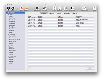 Track makes it very easy to capture your race session data by providing a clearly designed dialog. You see in a glance what informations are captured and you can make some changes later e.g. you can add all the data for a setup and capture the lap timings later or you can capture your lap timings first and add this data to a session later.
