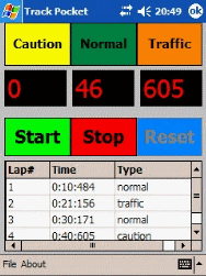Use your Windows Mobile powered PDA or Smartphone like a stop watch with Track Pocket. For every lap you can even choose the type like caution, traffic or normal lap. Save the captured timings to a file on your Pocket PC. Connect your PDA to a computer running Microsoft ActiveSync* on Windows system or Missing Sync for Windows Mobile* on a Mac OS X system and synchronize the timing data.
